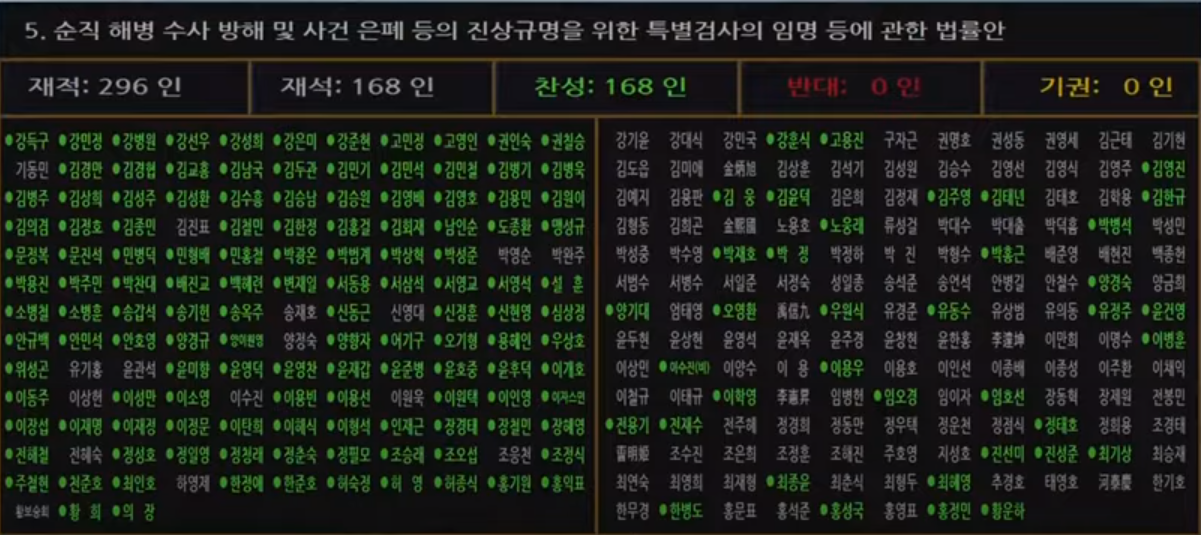 전체 의원 296명이 표결에 동참한다면 198명 이상의 동의가 필요한 상황이기 때문에 야당 단독으로 처리가 불가능하며 여당에서 이탈표가 17표 정도가 나와야 법안이 통과가 됩니다.