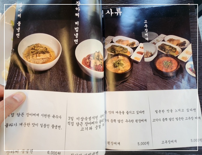 식사류 - 장아찌 비빔냉면 6,000원, 장아찌 물냉면 6,000원, 고추장찌개 5,000원, 된장찌개 5,000원