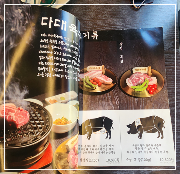 고기류 - 숙성 삼겹살(120g) 10500원, 숙성 목살(120g) 10,500원