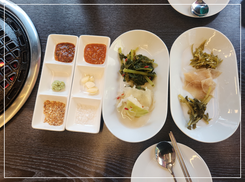음식점 안에는 테이블 5개 정도 있었고 날씨가 좋은 날에는 식당 앞 야외 테이블에서도 고기를 먹을 수 있다고 합니다. 저희는 미리 전화로 테이블을 예약하고 가서 그런지 테이블에 2인상을 차려 놓으셨습니다..