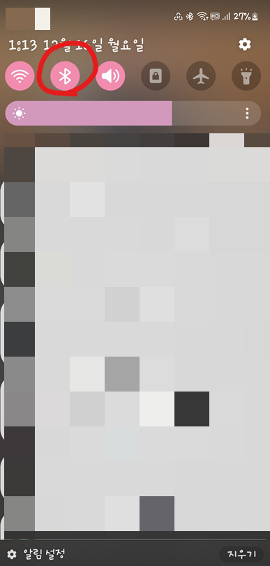이어폰을 착용한 다음 스마트폰에 블루투스를 활성화해 주세요. 블루투스 활성화 방법은 스마트폰 화면을 터치한 상태에서 아래로 내리면 설정 창이 열립니다.