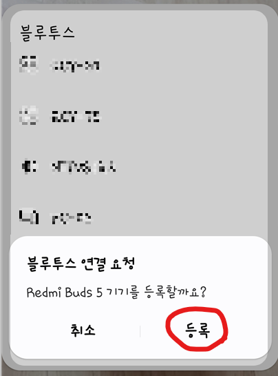 블루투스 연결 요청에서 등록을 눌러서 연결을 해주시면 이어폰 연결이 완료가 됩니다.