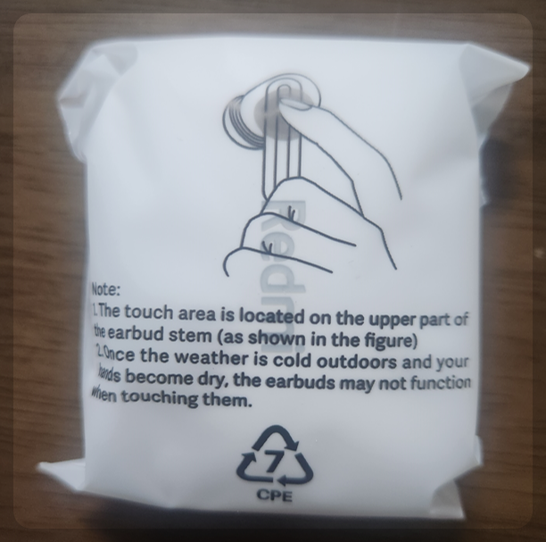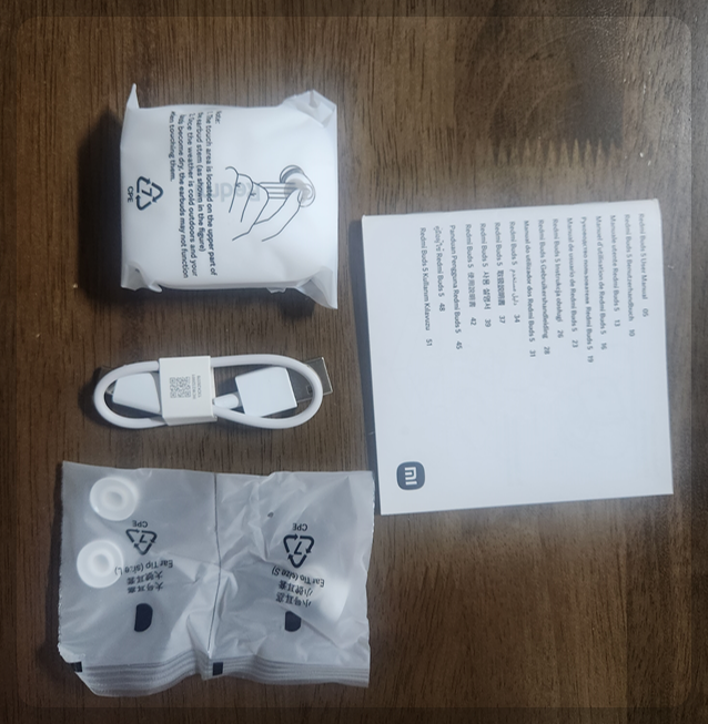 레드미 버즈 5의 구성품은 무선이어폰, 충전 케이블, 이어 팁, 사용 설명서가 들어 있어요. 이어 팁은 작은 사이즈와 큰 사이즈가 추가로 들어 있고 중간 사이즈는 이어폰에 장착이 되어 있습니다.