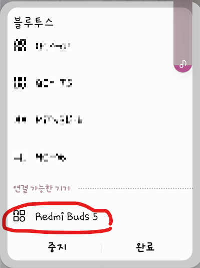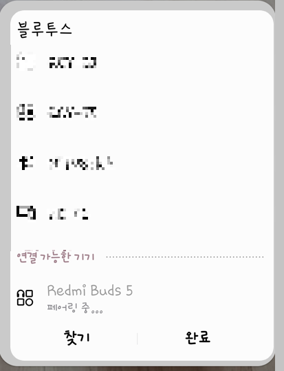 설정 창에서 블루투스 아이콘을 눌러 블루투스를 활성화시켜 주세요 그다음 블루투스 화면에서 찾기를 누르시고 Redmi Busds 5가 검색되면 연결해 주세요.