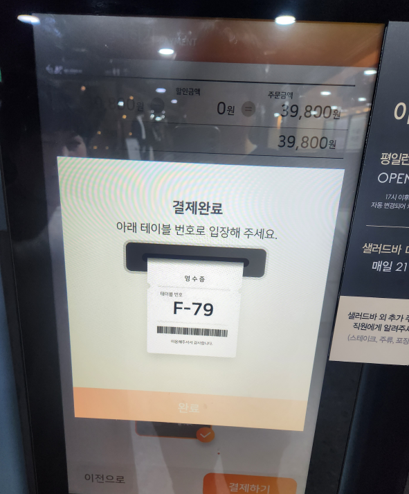 키오스크에 평일 런치치타임 적용으로 39,800원 결제하니 좌석표가 모니터에 출력이 되네요.