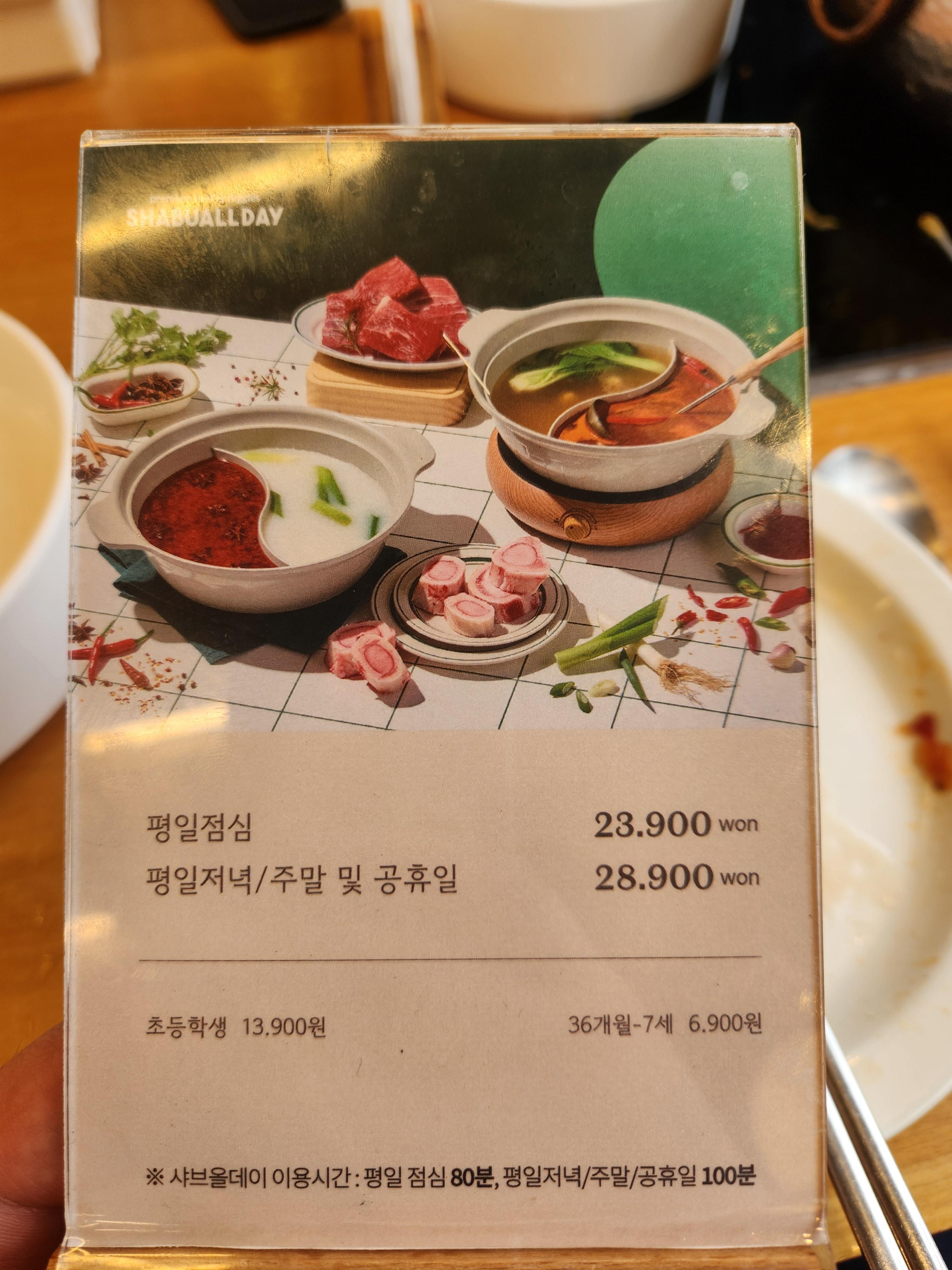 아래의 사진은 가격표입니다. 저희는 평일 점심을 먹어서 인당 23,900원에 식사를 했습니다. 평일 저녁과 주말 이용가격은 28,900원이네요. 평일 점심 이용시간은 80분이고 그 외에는 100분입니다.