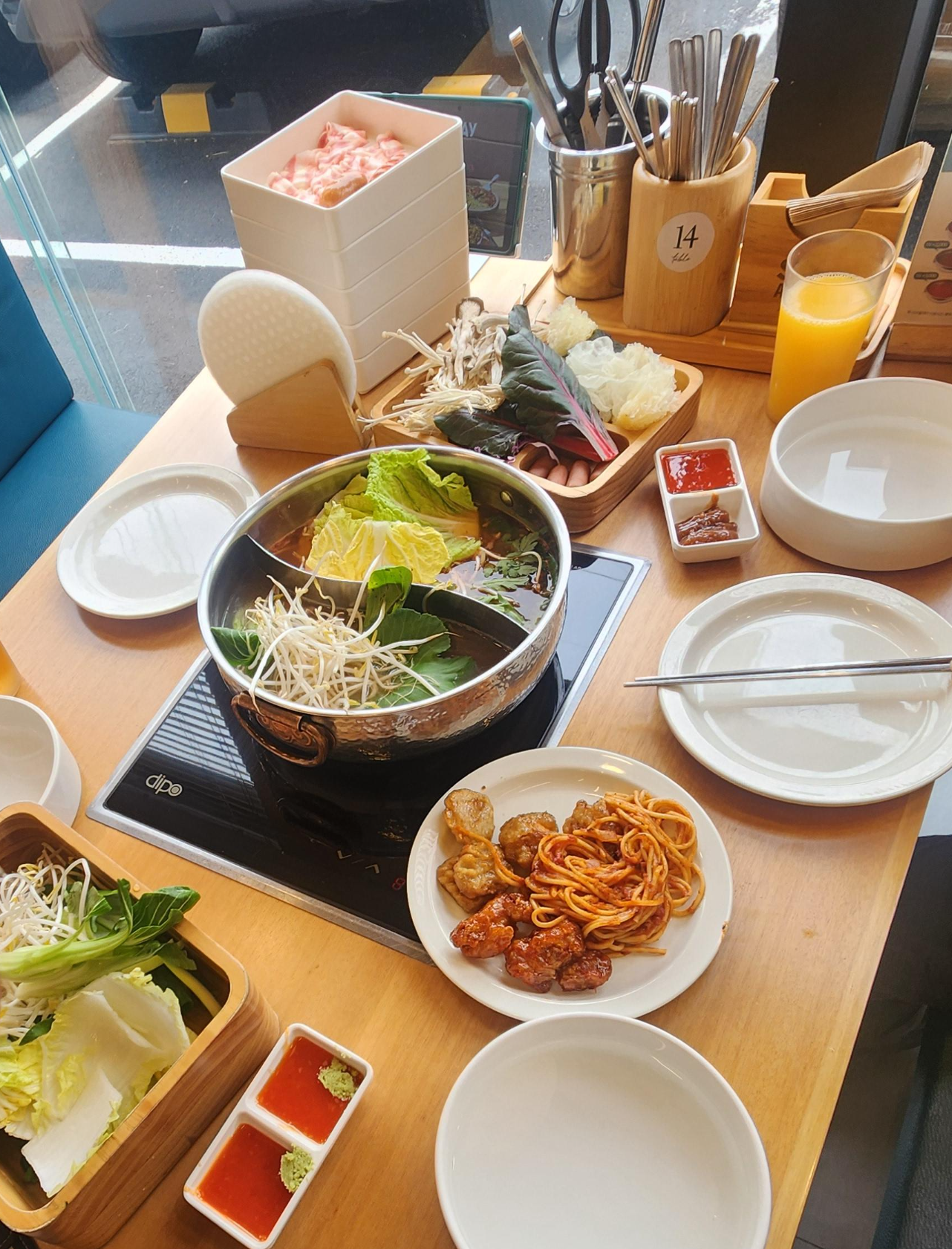 신나게 채소 및 음식을 담아왔네요. 솥에 고기와 채소를 넣고 신나게 먹었습니다. 맛도 괜찮고 채소도 신선해서 가족들과 함께 오면 좋은 곳인 거 같습니다.^^