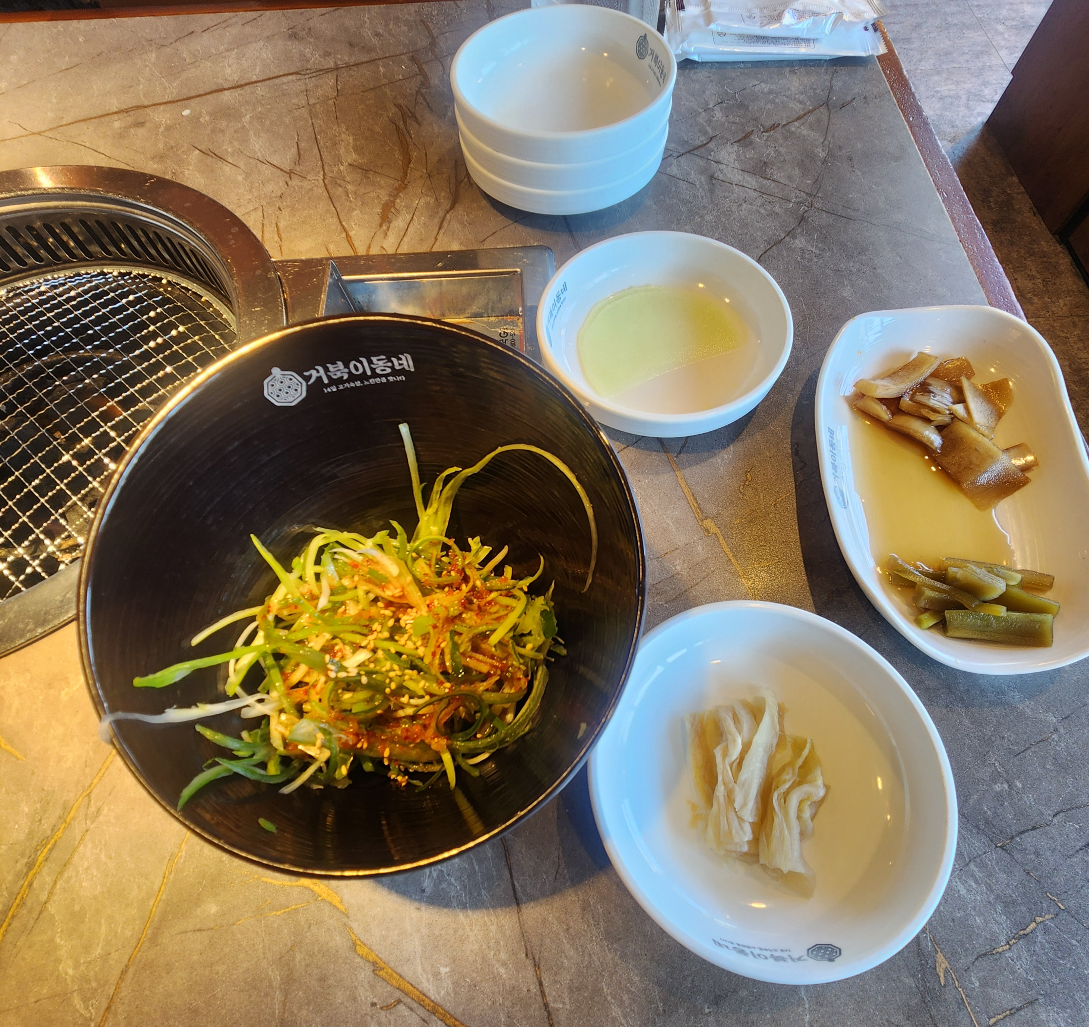 기본 상차림으로 파절이와 백김치 등이 나오는데요. 부족한 반찬은 셀프바를 이용하면 됩니다.