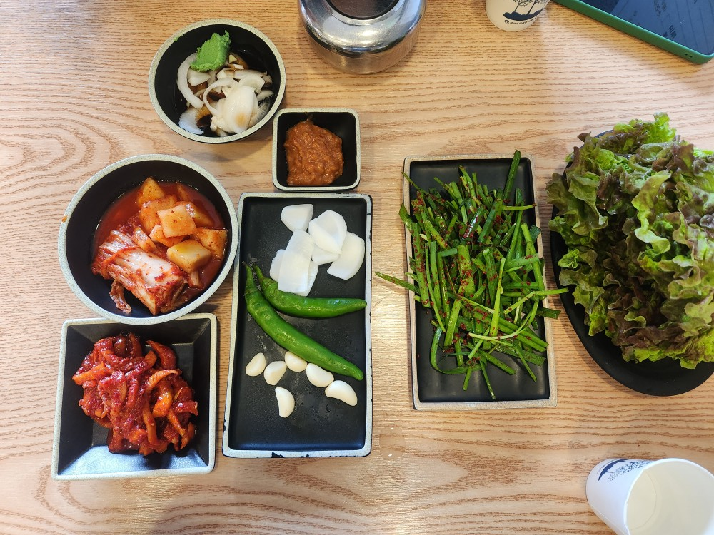 부추, 마늘, 고추, 양파절임, 김치, 상추 등 빠짐없이 준비되어 있네요~